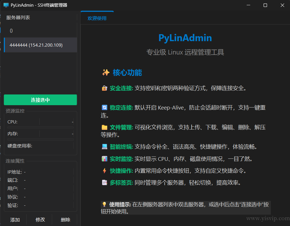 實時監控: 實時顯示 CPU、內存、磁盤使用情況,一目了然。